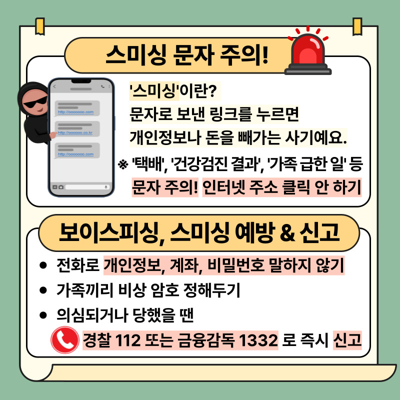 이번 복지정보는 보이스피싱과 스미싱에 관한 내용이예요.