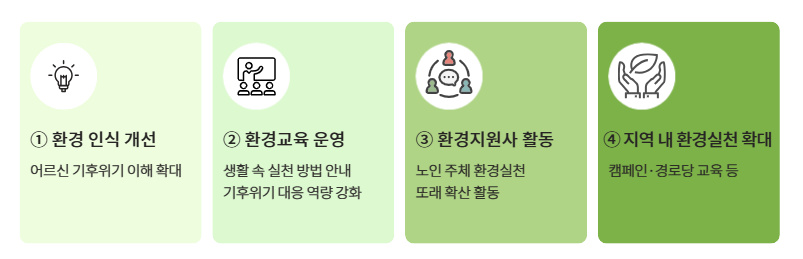| ② 환경지원사 활동 | 환경교육을 이수한 어르신이 환경지원사로 참여하여 복지관 및 지역사회에서 환경실천 활동을 수행합니다. - 지역 내 경로당 환경교육 및 환경활동 지원 / 환경실천 활동 참여 / 탄소중립 실천 캠페인 참여 ※ 어르신이 단순한 환경활동의 수혜자가 아닌 지역사회 환경실천의 주체로 참여할 수 있도록 지원합니다. |